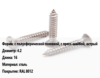 Саморез с полусферической головкой, с пресс-шайбой, острый D=4.2 L=16 сталь RAL 8012