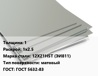 Лист нержавеющий 1 1х2.5 Сталь: 12Х21Н5Т (ЭИ811) Тип:матовый ГОСТ 5632-83